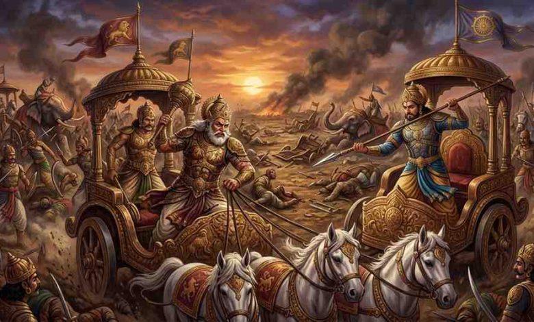The battle’s ferocity symbolizes the moral dilemmas faced by the warriors, reflecting their inner conflicts and commitment to dharma, or duty.